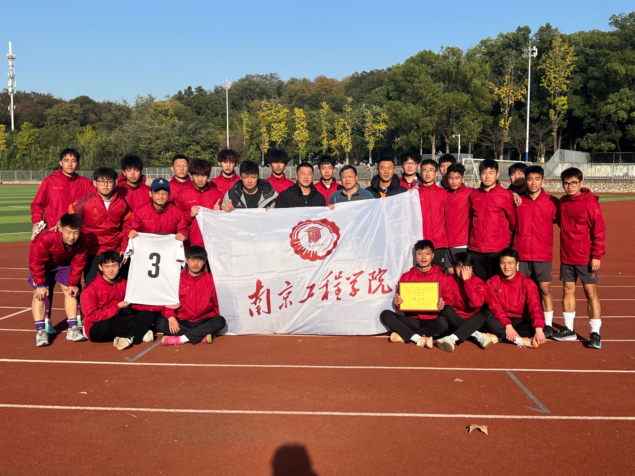 11月13-17日,由江苏省学生体协高校工作委员会主办、南京林业大学承办的2023年江苏省“省长杯”足球赛开赛。东南大学、江苏大学等八所省内高校代表队参赛,我校足球队在主教练万勃老师和赵泽宇老师的指导和带领下,历经五天五场高强度比赛,最终获得第三名的好成绩。