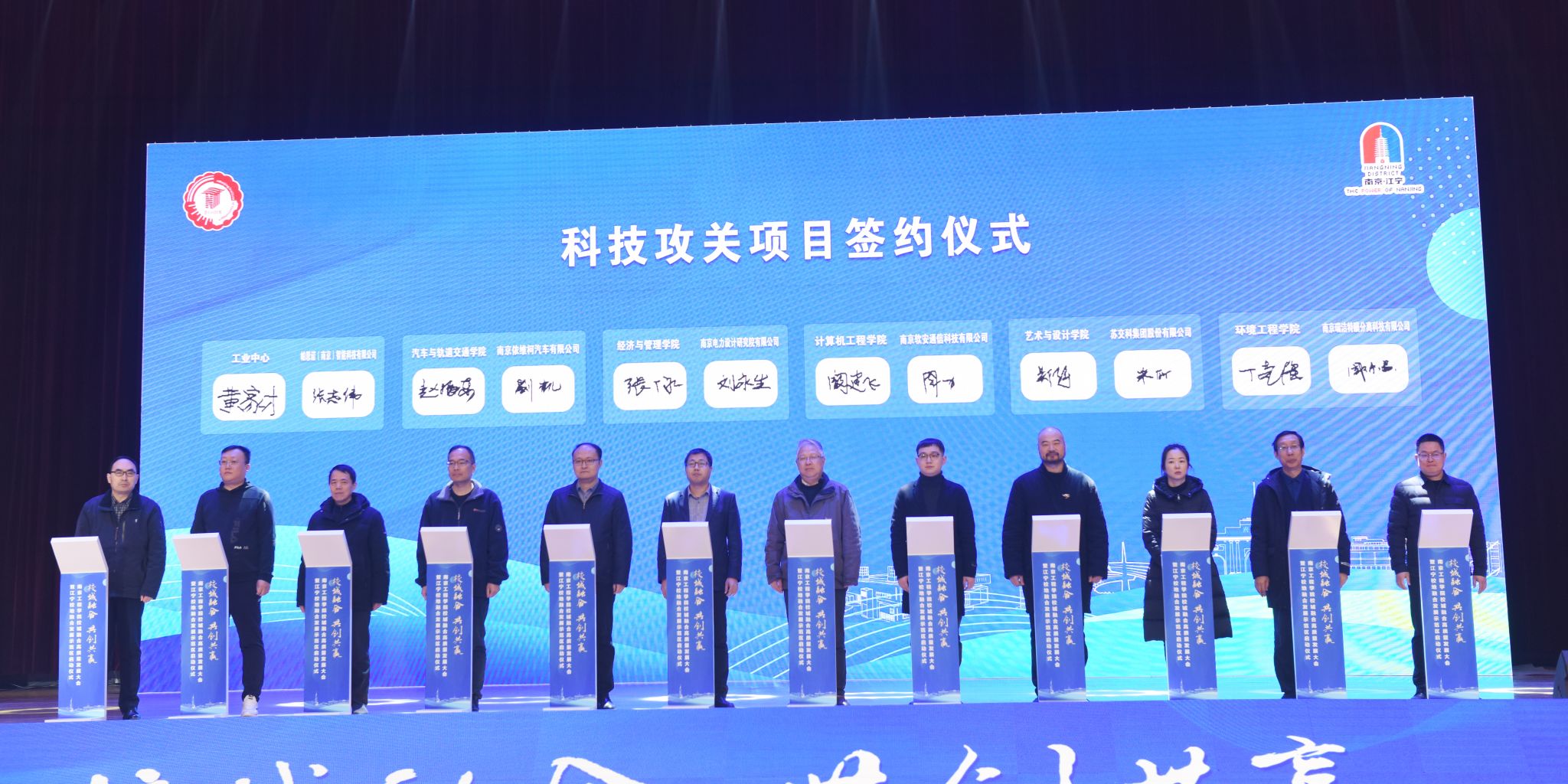 在与会人员的共同见证下,张仰飞与黄成文分别代表校地签订全面深化战略合作协议。江宁校地融合发展示范区同时正式启动,双方将整合南工程应用型高校的科教资源优势和江宁区的产业优势,以现有的新型研发机构、高等级平台、科技创业企业、大学科技园、技术转移中心、知识产权运营中心、产业学院和地方产业急需高水平应用型人才培养为基础,建成立足江宁、南京,辐射江苏的政产学研用为一体的校地融合发展示范区,打造全省领先、全国知名的校地融合发展典范区,共建“世界电谷”。